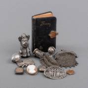 Divers klein zilverwerk, diverse gehaltes, waaronder: gebedenboekje met defect gouden slotje, twee maliënbeursjes en een zilveren cameebroche, gewicht zilver 110 gram