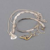Drie 1e gehalte zilveren colliers: één plat gourmet schakelcollier met hanger, 80 cm, één vergulde choker, 42 cm, en één gevlochten, 45 cm, gewicht 44,8 gram