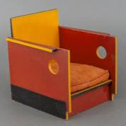 Multiplex miniatuurstoel gelakt in donkerrood, geel en zwart, met twee ronde gaten in de armleuningen en voorzien van kussentje, modelnummer 595, ontwerp Ko Verzuu, uitvoering ADO, onderop gemerkt, circa 1930, 20,5 × 20 × 19 cm