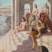 Gerrit Sol (1942), magisch realistische voorstelling van een Egyptisch mythologisch figuur en twee vrouwelijk naakten in een ruïne in de wolken, olieverf op paneel, l.o. gesigneerd en gedateerd '82-'95, 100 × 100 cm