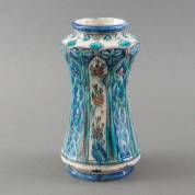 Delfts aardewerk vaas met Nieuw-Perzisch floraal decor, uitvoering De Porceleyne Fles, op onderzijde gemerkt 955 en onduidelijk schildersmerk ?B -twee grote chips van voet, twee kleine chipjes uit de bovenrand, glazuurdefecten, licht glazuurcraquelé-, 23,5 × Ø 11,5 cm