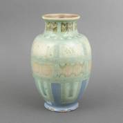 Aardewerk vaas met polychroom geometrisch decor in pastelkleuren, ontwerp Roelof Sterken, uitvoering onbekend, aan onderzijde gemerkt 'Ontw R. Sterken Holland' en met onbekend schildersmonogram -chip in hals en meerdere op de standring-, 27,5 Ø 18 cm