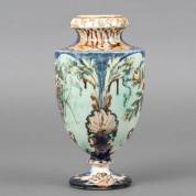 Balustervormige plateel vaas met decor van boeketten en rocailles, uitvoering Plateelbakkerij Rozenburg, Den Haag -restauratie aan verbinding voet en vaas-, hoogte 23,5 cm