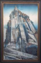 Wolfgang Korn (1949-2023), gezicht op toren, acrylverf op paneel, verso onduidelijk getiteld '[...] Nicolai[...] Hamburg' en gedateerd, 47 × 75 cm