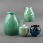 Vier diverse aardewerk vazen: twee groengeglazuurde vazen, uitvoering Kunstaardewerkfabriek St. Lukas, Maarssen -grootste met haarlijn in de hals-, één vaasje met lusterglazuur, ontwerp Gabriël Musarra, en een vaasje met blauw-zwart glazuur, uitvoering onbekend, grootste 27 × Ø 19 cm