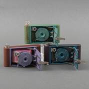 Drie fotocamera's: alle Kodak Petite's, in paars, blauw en groen, één met originele doos en handleiding, 1929-'33