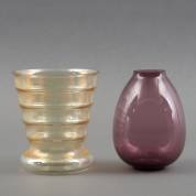 Geribbelde glazen vaas 'O' met goudluster, 15 × Ø 13 cm, en een paars glazen vaasje -randschilfer, krassen-, hoogte 15,5 cm, beide ontwerp K.P.C. de Bazel, uitvoering Glasfabriek Leerdam