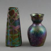 Twee glazen vazen met iriserend decor, één onderop toegeschreven aan Wilhelm Kralik Sohne -hoogste vaas met randschilfertjes-, 20,5 cm hoog