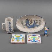 Divers aardewerk: mok en schaaltje met decor van haan, ontwerp Gustave Reynaud, jaren '60, aardewerk katje, ontwerp Rosina Wachtmeister, uitvoering Goebel, en twee aardewerk tegels met vogeldecor, afmetingen mok 14 × 11 × 7,5 cm