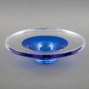 Ronde glazen schaal met blauwe voet, Unica MS77LL, ontwerp Floris Meydam, uitvoering L. v.d. Linden, Glasfabriek Leerdam, 1969 -kleine krasjes, lichte kalkaanslag-, 9 × Ø 32 cm