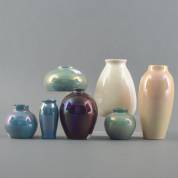 Zeven diverse aardewerk vaasjes, waarvan zes met lusterglazuur, alle uitvoering St. Lukas, Utrecht -enkele minieme defecten-, hoogste 16 cm