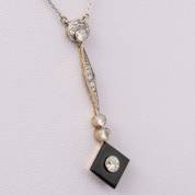 14kt witgouden collier van jasseronschakels waaraan 14kt wit- en geelgouden hanger gezet met ruit van onyx en veertien diamanten in oud slijpsel, brutogewicht 4,0 gram, 42 cm, hanger 4,5 cm
