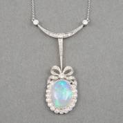 18kt witgouden lavalièrecollier met jasseronschakels met midden voor een hanger met strikmedaillon gezet met ovaal cabochongeslepen opaal, circa 1,5 × 0,8 cm omgeven door diamanten in oud slijpsel en roosgeslepen diamanten, met verlengstukje, brutogewicht 6,6 gram, 38 en 45 cm -één diamantje mist-