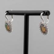 Paar 18kt witgouden entourage-oorhangers, elk gezet met donkere vuuropaal, totaal circa 2.20ct omgeven door 18 briljantgeslepen diamanten, totaal 0.70ct,brutogewicht 4,6 gram, 2,2 cm