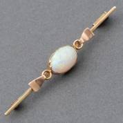 14kt gouden staafbroche gezet met ovaal cabochongeslepen opaal, brutogewicht 4,2 gram, 6 cm