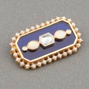 18kt gouden broche gezet met blauw glas, vier cabochongeslepen opalen, roosgeslepen diamant en zaadpareltjes, brutogewicht 11,0 gram, 3,5 × 2,2 cm
