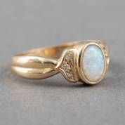 14kt gouden ring gezet met ovaal cabochongeslepen opaal geflankeerd door zes enkelgeslepen diamanten, gemerkt: Juwelier Esmann, Utrecht, mt. 17, brutogewicht 3,0 gram