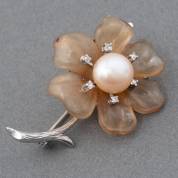 14kt witgouden bloembroche met kunststof bloembladeren, het bloemhart gezet met roze parel en zes achtkantgeslepen diamanten, brutogewicht 7,2 gram
