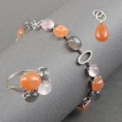 Driedelige witgouden set, gemerkt Tirisi, bestaande uit: 18kt witgouden armband, 14kt witgouden ring, mt. 18, en 18kt witgouden hanger, alle gezet met cabochongeslepen maansteen en diamant, de armband en ring eveneens gezet met cabochongeslepen rozenkwarts, brutogewicht 35,4 gram, armband 20 cm, hanger circa 3,5 cm