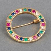 14kt gouden cirkelvormige broche gezet met carrégeslepen smaragd, saffier, robijn en diamant, brutogewicht 9,2 gram, Ø 3 cm