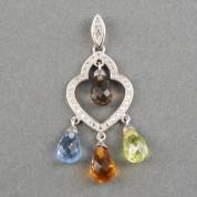 14kt witgouden hanger gedecoreerd met pavégezette diamanten, waaraan briolettes van rookkwarts, spinel, citrien en lemonkwarts, brutogewicht 5,4 gram, 4,5 cm
