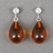 Paar 18kt witgouden oorhangers, elk gezet met briljantgeslepen diamant, totaal circa 0.40ct, en druppelvormige amber, brutogewicht 3,4 gram, 2,2 cm