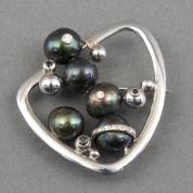 14kt witgouden broche gezet met vijf donkere gecultiveerde zoetwaterparels en twaalf diamanten, waarvan drie in de kleur zwart en twee gezet in een parel, brutogewicht 19,6 gram, 5 × 4,5 cm