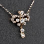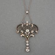 1e gehalte zilveren en 14kt gouden jugendstil lavalièrecollier bestaande uit zilveren jasseron schakels, goud en zilver opengewerkt jugenstil ornament gezet met 33 diamanten in oudslijpsel, centrale steen circa 0.30ct, totaal diamantgewicht geschat op 1.0ct, mogelijk Frankrijk, circa 1900, butogewicht 9,0 gram, circa 40 cm