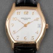 18kt gouden herenpolshorloge, Patek Philippe, Gondolo, de wijzerplaat met Breguet cijfers en dagaanduiding, aan originele zwart lederen band met originele 18kt gouden gespsluiting, referentienummer: 5030R-010, uurwerk: caliber 315 SC automaat, Ø 34 mm -originele doos aanwezig, map met certificaat van echtheid en aankoopbewijs inclusief diverse Schaap & Citroen bonnen en boekwerkje aanwezig-