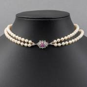 Tweestrengs parelcollier van gecultiveerde parels aan 18kt witgouden sluiting gezet met een entourage van zeven robijntjes, 39 cm