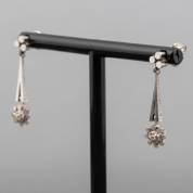 Paar 14kt witgouden oorhangers gezet met briljantgeslepen diamantje in dubbele spiegelzetting, brutogewicht 4,4 gram, 3 cm