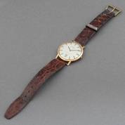 14kt gouden herenpolshorloge, Tissot, model Visodate Stylist, handopwind, champagnekleurige wijzerplaat met datum, aan bruin lederen band, circa 1970, brutogewicht 27,2 gram, kast Ø 34 mm