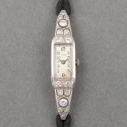 18kt witgouden damespolshorloge, mechanisch uurwerk, de kast gezet met 18 diamanten in diverse slijpvormen, aan zwart koordband met onedele clipsluiting, brutogewicht 13,2 gram, kast 5 × 1,3 cm