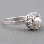 14kt witgouden entouragering gezet met parel en veertien bolsjewiekgeslepen diamanten, mt. 18, brutogewicht 3,0 gram