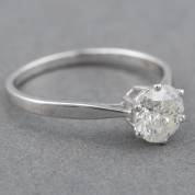 14kt witgouden solitairring gezet met briljantgeslepen diamant, circa 1.30ct, kwaliteit P3, kleur H/I, brutogewicht 1,8 gram