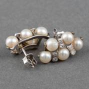 Paar 14kt witgouden oorstekers, elk gezet met vijf vermoedelijk natuurlijke parels en zes achtkantgeslepen diamanten, brutogewicht 4,2 gram, 2 cm -restauraties zichtbaar-