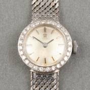 18kt witgouden damespolshorloge, mechanisch uurwerk, bezel gezet met 28 achtkantgeslepen diamanten, aan 14kt witgouden Milanese band, brutogewicht 27,6 gram, 17 cm