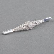 14kt witgouden staafbroche gezet met diamant in oudslijpsel omgeven door roosdiamantjes, brutogewicht 2,8 gram, 5 cm