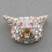 18kt gouden en 2e gehalte zilveren broche in de vorm van een vossenkopje, volledig pavégezet met diamant en twee robijnen oogjes, brutogewicht 9,0 gram