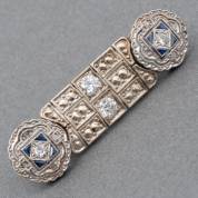 14kt wit- en geelgouden speld gezet met acht triangelgeslepen blauwe saffieren en vier diamanten in oudslijpsel en vier roosgeslepen diamanten, brutogewicht 4,6 gram, 4,5 cm