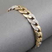 14kt wit- en geelgouden plat gourmet schakelarmband, de witgouden schakels pavégezet met diamant, aan bakslot met veiligheidsachtjes, brutogewicht 63,2 gram, 19,5 cm