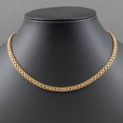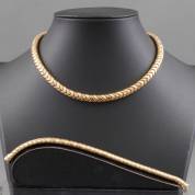 14kt gouden slangcollier en armband, a double usage, de V-vormige schakels afwisselend gesatineerd, gewicht 91,8 gram, 45 en 20,5 cm