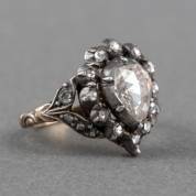 14kt gouden ring met centrale peervormige roosdiamant, circa 0,75ct, en omgeven door kleinere roosgeslepen diamantjes in zilveren zetting, mt. 16,25, brutogewicht 5,4 gram, inclusief juwelierscertificaat