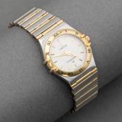 Stalen damespolshorloge, Omega, Constellation, 18kt gouden de lunette, aan geïntegreerde stalen band met 18kt gouden staafjes, referentienummer: 795.1202, uurwerk Cal 1456 quartz, circa 1990, Ø 25 mm -gebruikssporen-