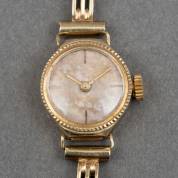 14kt gouden damespolshorloge, mechanisch uurwerk, aan 14kt gouden schakelband met veiligheidsketting, brutogewicht 20,6 gram, 17,5 cm