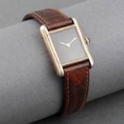 Verguld 1e gehalte zilveren damespolshorloge, Cartier Tank, handwind uurwerk, genummerd: 3 062778, bruine wijzerplaat, aan bruin lederen band, jaren '70, brutogewicht 20,8, 2,5 × 1,8 cm