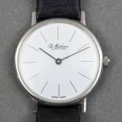 Stalen polshorloge, Ole Mathiesen, Kopenhagen, type: 1962 Classic, quartz uurwerk, witte wijzerplaat, saffierglas, aan zwart lederen band, Ø 26 mm