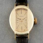 14kt gouden damespolshorloge, Prisma, mechanisch uurwerk, ovale kast met goudkleurige wijzerplaat, aan zwart lederen band, brutogewicht 13,6 gram, 2,2 × 1,7 cm -knop werkt niet-