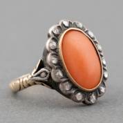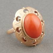 14kt gouden ring gezet met ovaal cabochongeslepen bloedkoraal, mt. 16,5, brutogewicht 5,6 gram