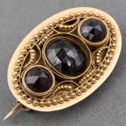 Ovale 14kt gouden broche gedecoreerd met granules en gezet met gefacetteerde granaat, brutogewicht 6,4 gram, 3 × 2 cm